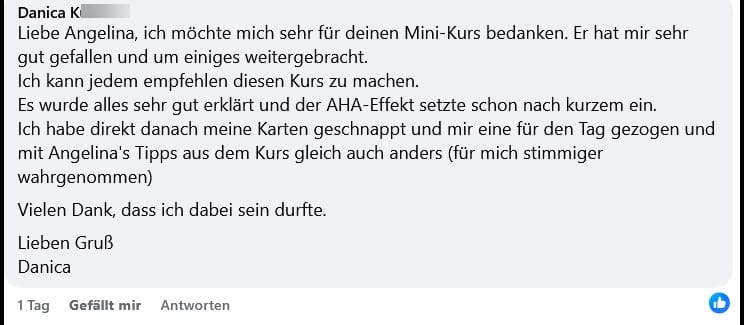 Du ziehst zu deiner Frage eine Karte und lernst, daraus eine klare und stimmige Antwort zu erkennen. Mit etwas Übung kannst du diesen Blick später auch auf mehrere Karten übertragen und wirst merken, wie sich dein Verständnis Schritt für Schritt erweitert.