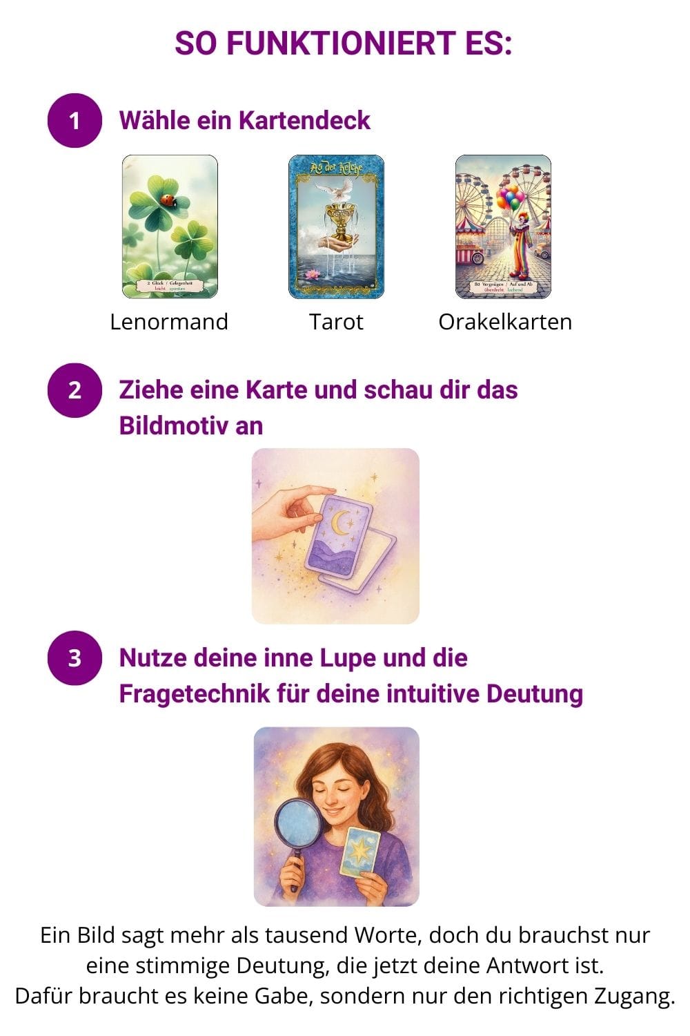 Du erfährst, warum Bilder viel mehr sagen als Worte und wie dein Inneres beim Blick auf eine Karte wie von selbst reagiert. Mit Beispielen, die dir zeigen, worauf du achten kannst.