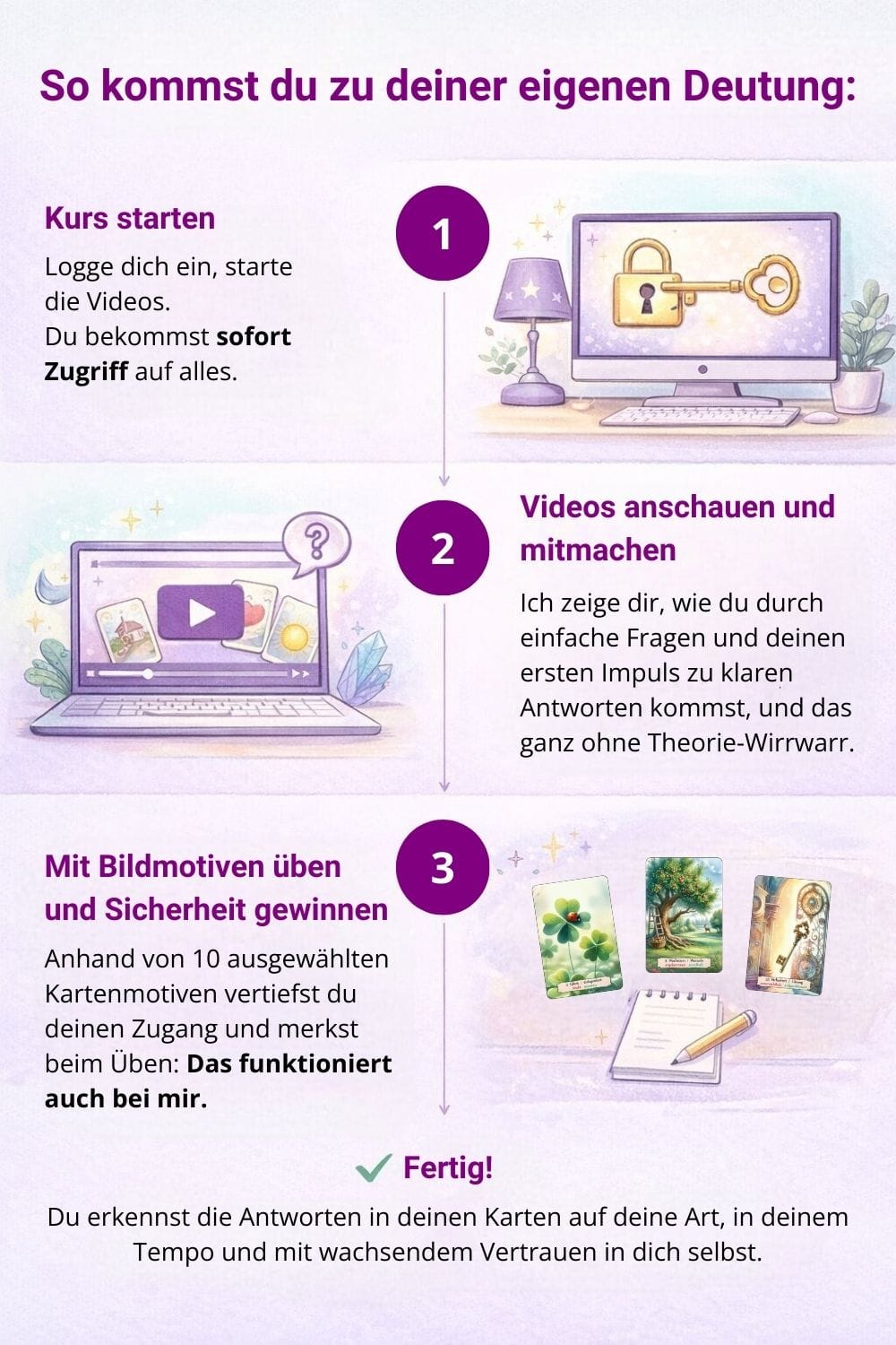 👉 Dieser Kurs ist ein Einstieg, um die Karten leichter deuten zu können. Auf diesen Deutungstechniken kannst du ideal weiter aufbauen.